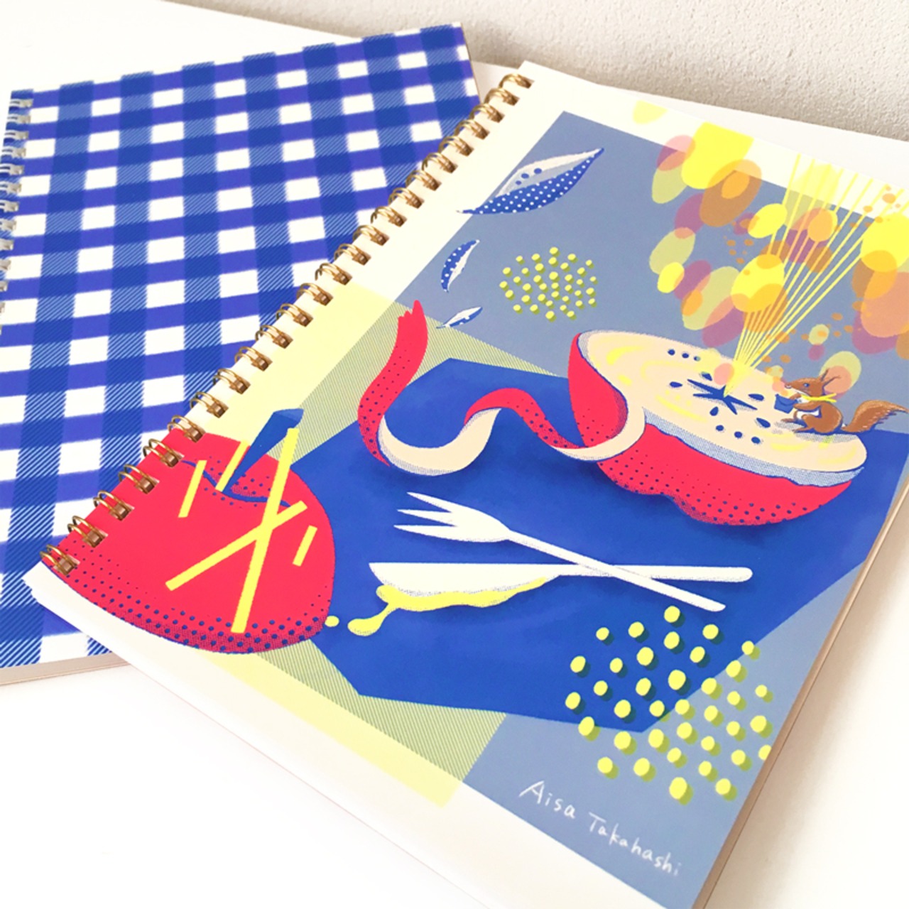表紙にはオリジナルのイラストを、裏表紙にはレッドのチェック柄をそれぞれデザインし、ゴールドのリングを合わせてあります。